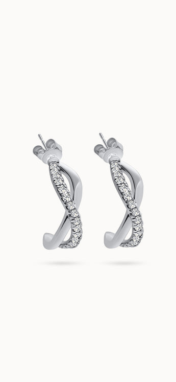 Infinity hoop earrings offer a fresh take on classic elegance. Featuring a sleek sculptural twist design in a radiant sterling silver finish with moissanite gemstones to add endless sparkle.
